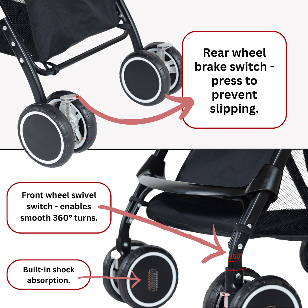 🛑 Safety Features: Equipped with a rear wheel brake switch, 360-degree rotation with built-in shock absorption, and a 5-point safety harness with one-click release.