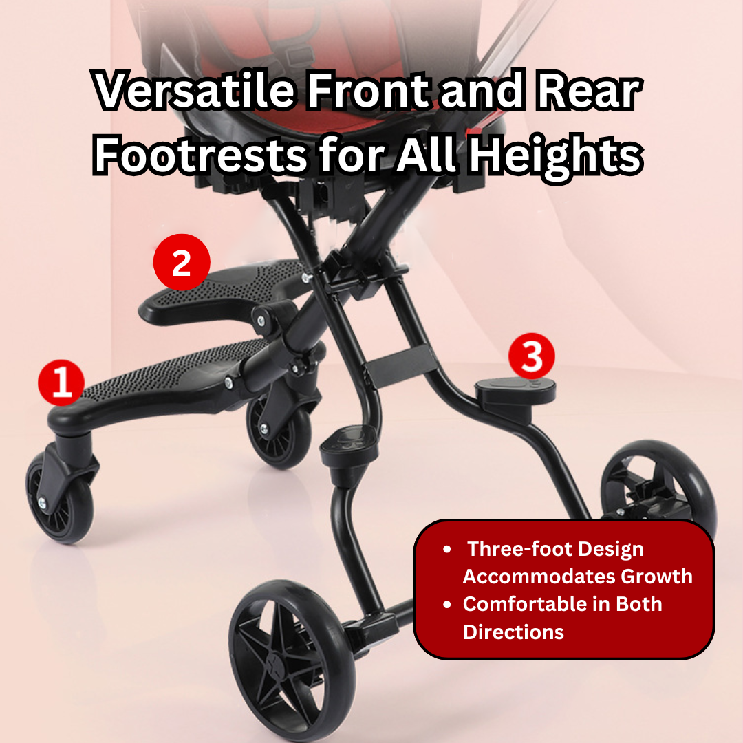🔄 Front and rear footrests for all heights, 3-foot design accommodates baby’s growth.