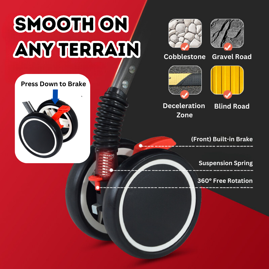 🚀 Smooth Maneuvering: Navigate any terrain effortlessly with built-in brakes, suspension spring, and 360° free rotation wheels.